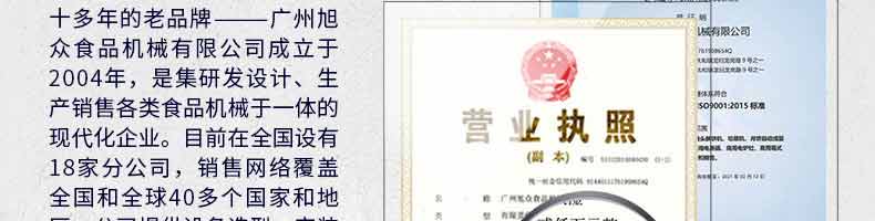 廣州旭眾食品機械有限公司是一家集科研開發,生產設計,營銷服務為一體的現代化生產企業。現代化生產車間,精湛制造技術,所產機械歷經市場重重考驗,不斷贏得海內外客戶的贊譽。